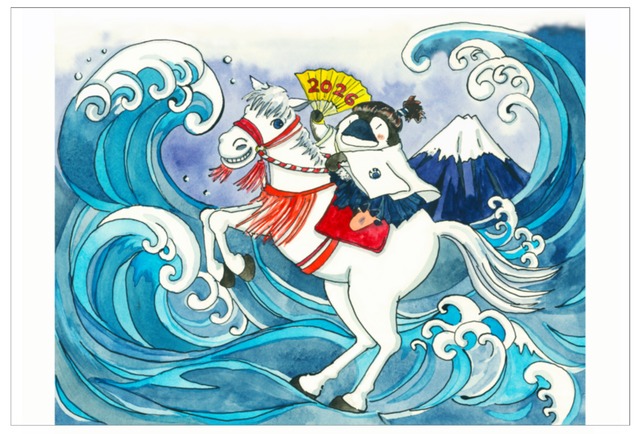 ※1枚の商品です。 来年の干支はウマ、、、うまとペンギンどう表現すればいいのか悩んだところ、 暴れん坊将軍が浜辺を馬で疾走するシーンから着想しました! 暴れん坊ペンギンです!富士山をバックに荒ぶる浪裏を疾走する馬で表現! おめでたいご挨拶にどうぞ!! ************** 1枚 のみの商品です。 紙:マット調 高級印刷ファイン用紙。 配送はポスト投函となります。梱包材にはリサイクル品を使用することがあります。 ※お年玉付き年賀はがきではありません。切手はついていません。