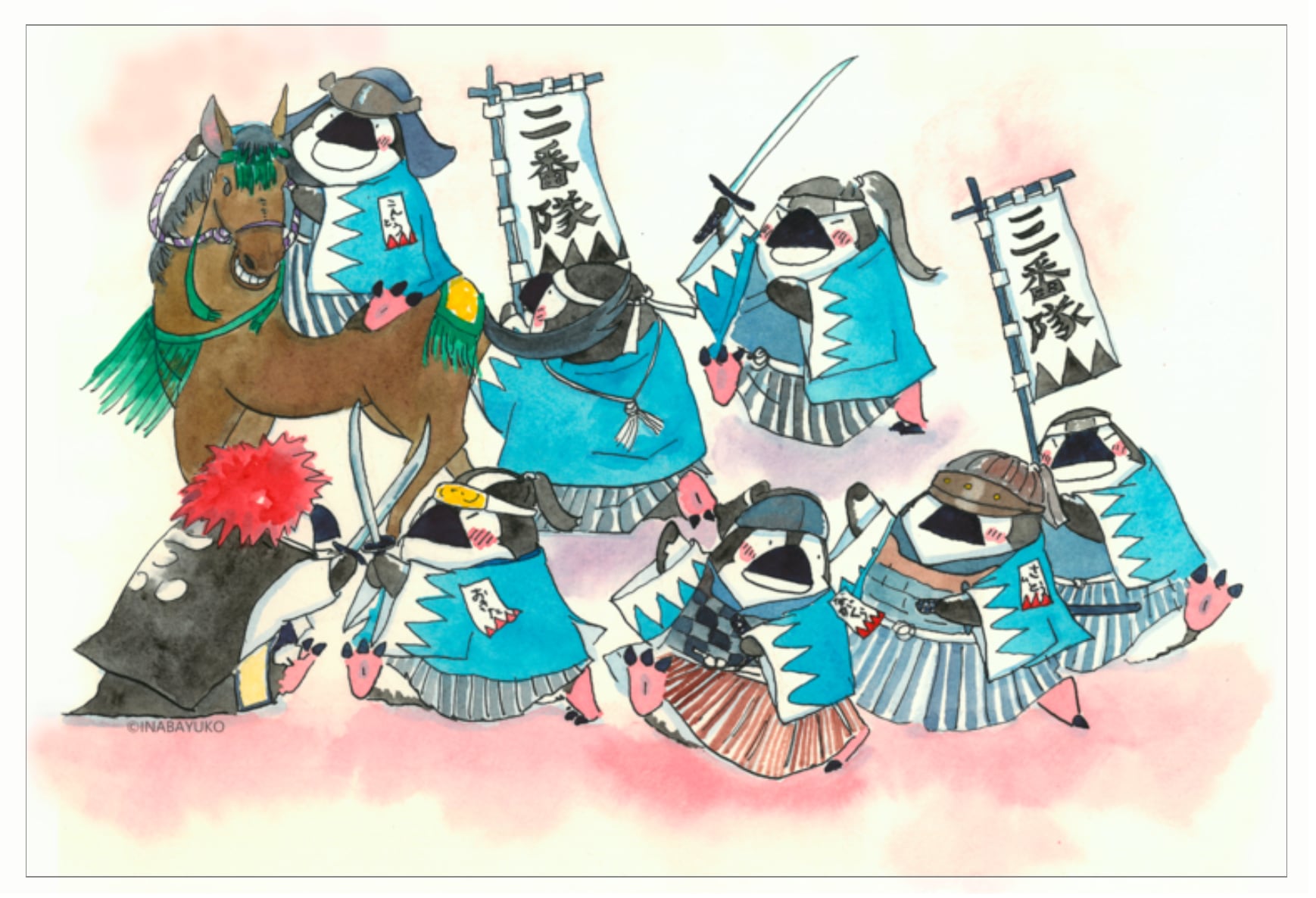 忠義の志士、新選組の勇ましい行進がなでがたペンギンで描かれたポストカード3枚セットです!3枚をならべると、一幅の絵巻物(?)になりますよ!